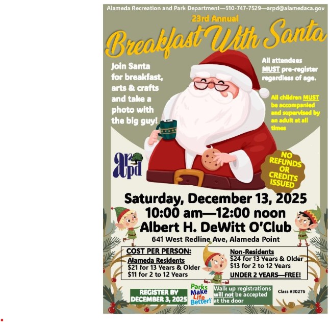23rd Annual Breakfast With Santa in AlamedaOn December 13, 2025![]() Join Santa for Breakfast Arts and Crafts and take a photo with the Big Guy! (Register by the 3rd of December)… >>Read more |